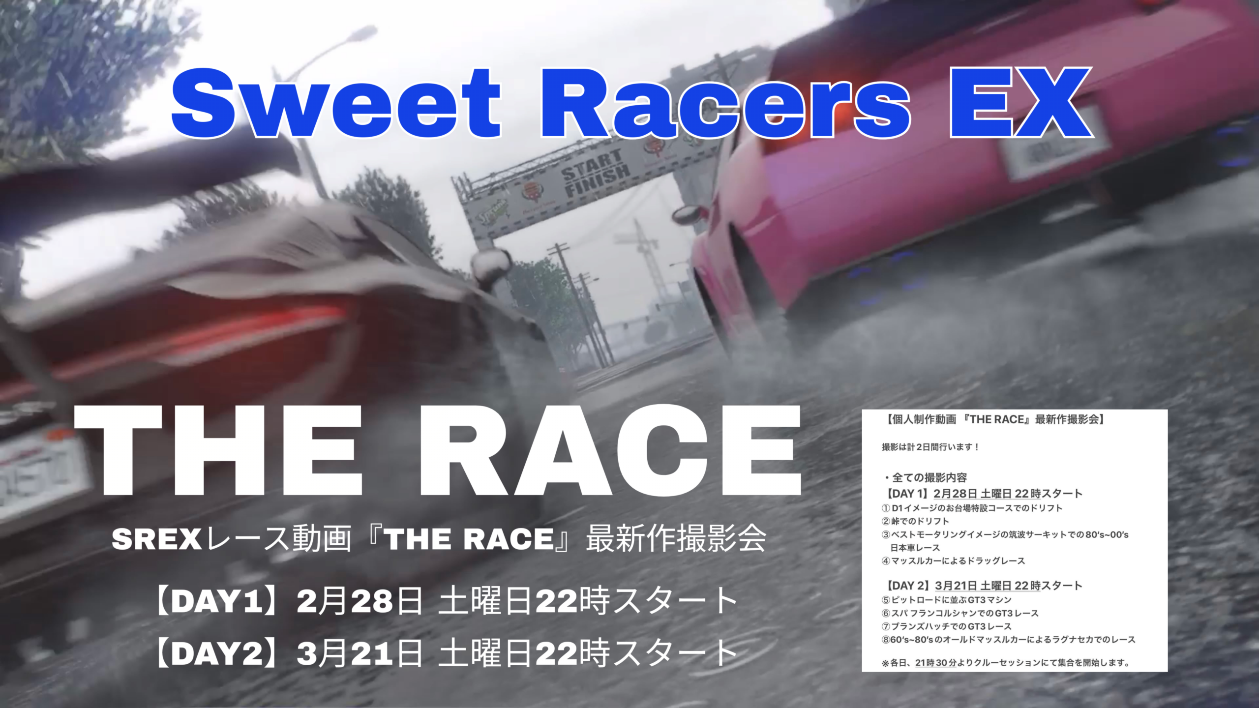 クルー紹介 GTA5レースクルー「SREX」の活動内容 more レース結果 注目のイベント・レース結果を発表! more 歴代CHAMPION 過去の大会結果と歴代チャンピオンの紹介 more Sweet Racers EX【SREX】の歩み GTAOnlineでのレースを取り巻く出来事やSREXの成り立ちを年表にまとめました GTA Races & SREX Timeline Information 2026年2月15日 / 最終更新日 : 2026年2月21日 メガーヌ 2月21日(土)22時よりSSC2026シリーズ開幕戦『SWEET SATURDAY CUP 118』開催!SREX王道スポーツカーバトル! SSC2026シリーズ Round 1 SWEET SATURDAY CUP 118 2月21日(土) 22:00 START [PS5拡張版] 2015年11月から始まったSREX最高峰のレースシリーズSWEET SA […] 2026年2月8日 / 最終更新日 : 2026年2月11日 メガーヌ 2月14日(土)22時より『SREXラリー選手権』開催!誰でも参加できるラリーレース! SREXラリー選手権 2月14日(土)21:50招待開始 22:00START 🏁[PS5] クルー関係なく誰でも参加できる走行会SREX SATURDAY MEETING“SSM” 集え、ラリースト!今回のSSMはコ […] 2026年1月26日 / 最終更新日 : 2026年1月27日 メガーヌ 1月30日(金)22時より月末金曜エンジョイレース『SREX FriYAY』開催! SREX FriYAY 1月30日(金)21:50招待開始 22:00START 🏁[PS5] 誰でも参加できるSREX×レース勢交流会!月末金曜日恒例エンジョイレースイベント“SREX FriYAY”!毎回使用コース […] 2026年1月19日 / 最終更新日 : 2026年1月19日 メガーヌ 1月24日(土)22時より『SREX SATURDAY MEETING〜クラスポフェス〜』開催!誰でも参加できるクラシックスポーツの祭典! SREX SATURDAY MEETING 〜クラスポフェス〜 1月24日(土)21:50招待開始 22:00START 🏁[PS5] クルー関係なく誰でも参加できる走行会SREX SATURDAY MEETING“S […] Blog 2026年2月15日 / 最終更新日 : 2026年2月15日 メガーヌ SSM 『SREXラリー選手権』CR-GR-R902さん、ymca4869ytt-nyanさん、stella_rastyさん、yuuringo_the93さんのイベントレース動画 2月14日に開催された『SREXラリー選手権』CR-GR-R902さん、ymca4869ytt-nyanさん、stella_rastyさん、yuuringo_the93さんのイベントレース動画です! CR-GR-R902 […] 2026年1月31日 / 最終更新日 : 2026年2月3日 メガーヌ SREX FriYAY 『SREX FriYAY』ymca4869ytt-nyanさん、stella_rastyさんのイベントレース動画 1月30日に開催された『SREX FriYAY』ymca4869ytt-nyanさん、stella_rastyさんのイベントレース動画です! ymca4869ytt-nyanさん stella_rastyさん   […] 2026年1月25日 / 最終更新日 : 2026年2月2日 メガーヌ SSM 『SREX SATURDAY MEETING〜クラスポフェス〜』CR-GR-R902さん、ymca4869ytt-nyanさんのイベントレース動画 1月24日に開催された『SREX SATURDAY MEETING〜クラスポフェス〜』CR-GR-R902さん、ymca4869ytt-nyanさんのイベントレース動画です! CR-GR-R902さん ymca4869y […] 2026年1月11日 / 最終更新日 : 2026年1月11日 メガーヌ SSM 『SREXニューイヤーミーティング2026』ymca4869ytt-nyanさんのイベント動画 1月10日に開催された『SREXニューイヤーミーティング2026』ymca4869ytt-nyanさんのイベント動画です!